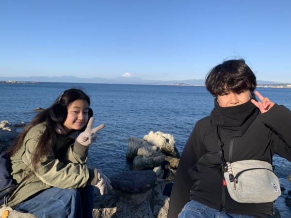 森戸神社から見える、富士山&江の島。当日は良い天気だったのでかなりクリアに見ることができました。元旦からしっかり富士山が見られるのもこのエリアの良いところかもしれません。